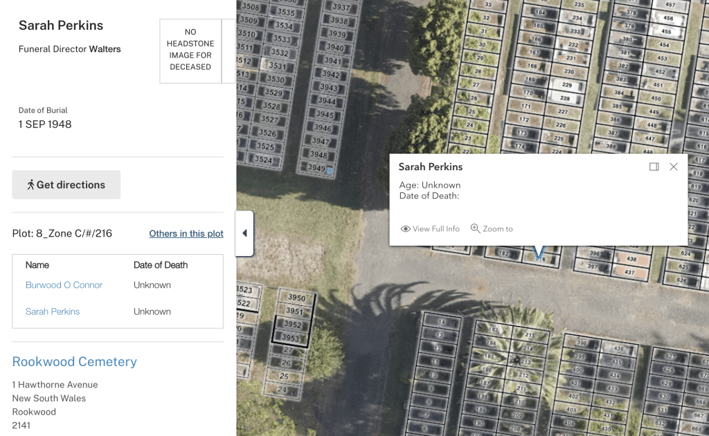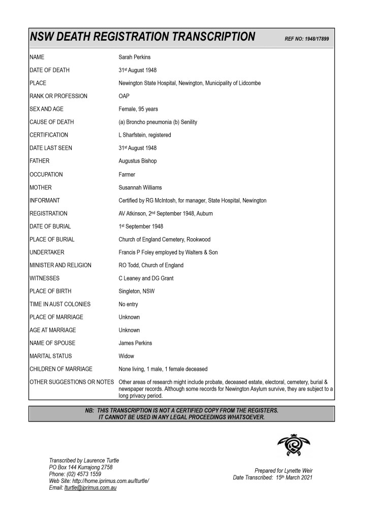 - NSW Death Registration Transcription – Sarah Ann Perkins REF: 1948/17899
