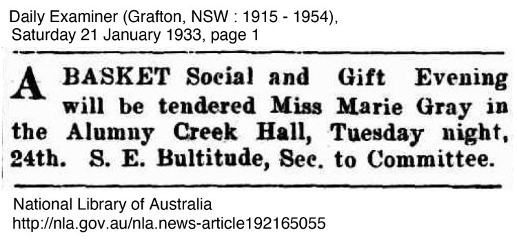 The move to Cudgen was a significant one for the family and when they spoke of it, it seemed that they spent some time living there but that is not actually the case. On 26 October 1940 Marie’s brother Harry had got married in Bathurst with their mother Emma Gray attending the wedding. Emma returned home to the farm at Alumny Creek on 5 November. On the 15 November Emma Gray fell while going out to shoot a hawk attacker her chickens. The gun she was carrying went off and she was killed, the inquest ruled accidental death.