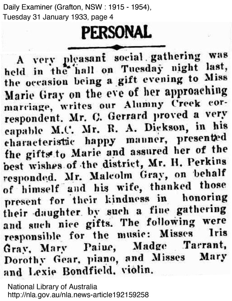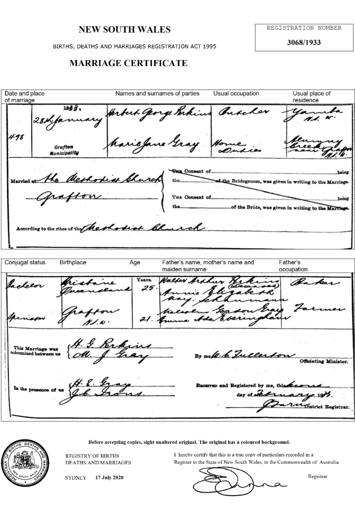 Marie Jane Gray married Herbert ‘George’ Perkins on 28th January 1933 at the Methodist Church in Grafton.