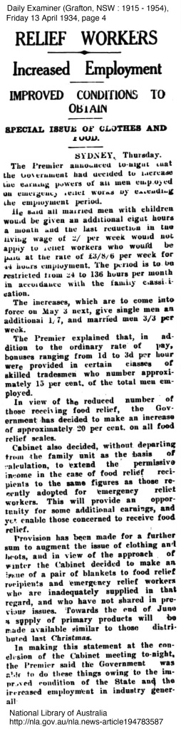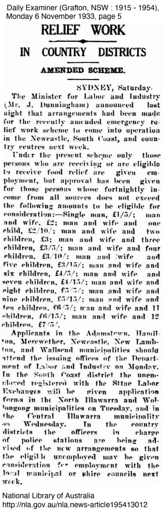 The wage for relief work in November 1933 was £2/10/: for a man and wife with one child with the rate being amended in April 1934 under the Dunningham Scheme to an additional 3/3 per week. Amendments to hours worked were adjusted as well as special issues of clothes and food. Suffice it say the wages and conditions could be difficult for Emergency Relief Workers.