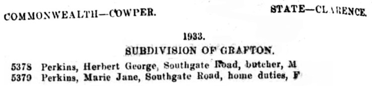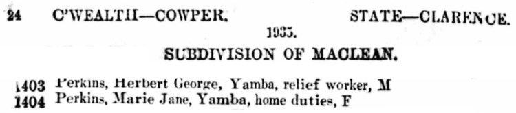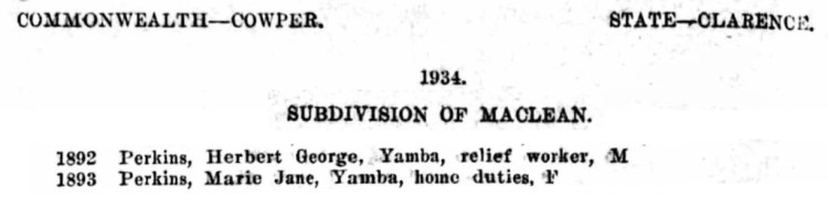 A second electoral roll for 1933 lists Marie and George Perkins in Yamba with George woking as a ‘Relief Worker’.