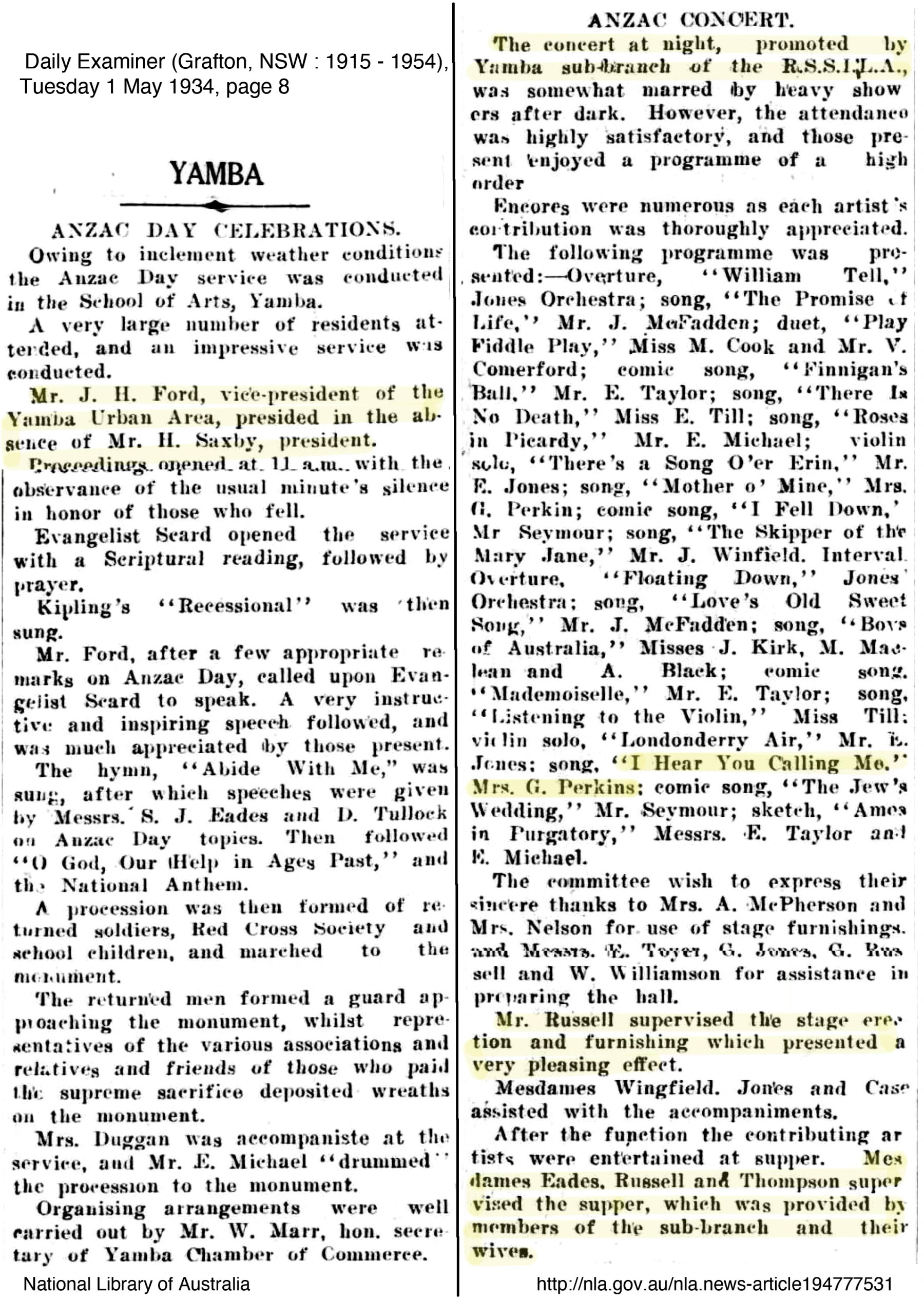 The whole ownership of the property eventually was fully transferred to Lil Black on 29 September 1959. It is likely this close neighbourly relationship between the Schaumann’s and the Ford’s helped George Perkins’ inclusion as part of the group of seven to twelve men employed as part of the Relief Work program at Yamba under the guidance of Henry Ford. The closeness of the families can also be seen in that it was Marie who was the organist at the wedding of Lil Ford to Harold Walter Black. The 1934 ANZAC day service and concert report include Henry Ford, Herbert Russell, May Russell and Marie Perkins all contributing. Henry Ford’s 17 years of working for the Yamba community was acknowledged when he retired from the Yamba Urban Area Committee in December 1947. He died on 25 May 1963 aged 87 years and is buried with his wife Annie (nee Redard) in Maclean Cemetery.