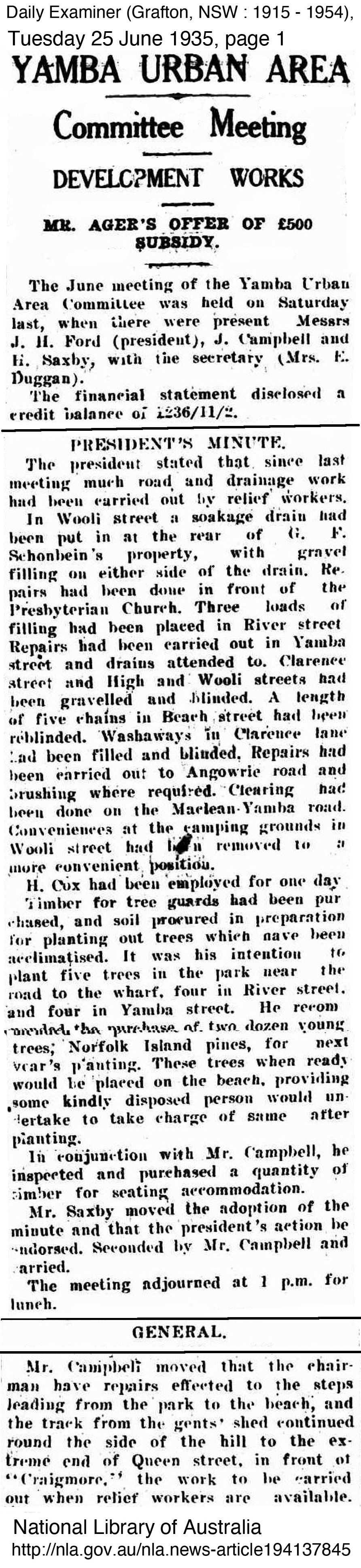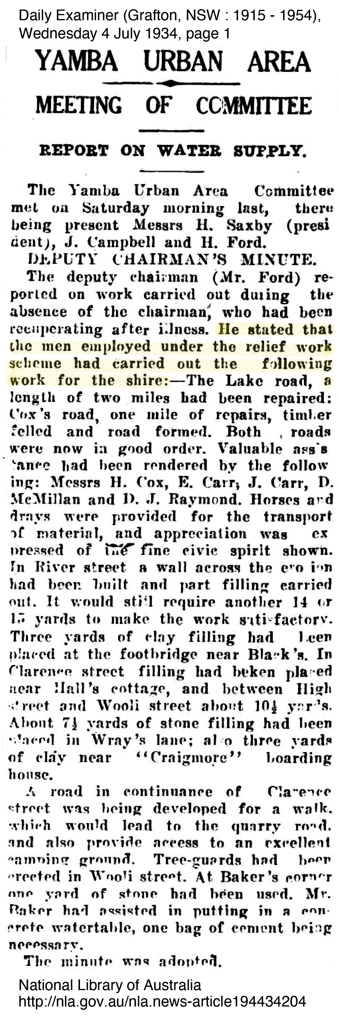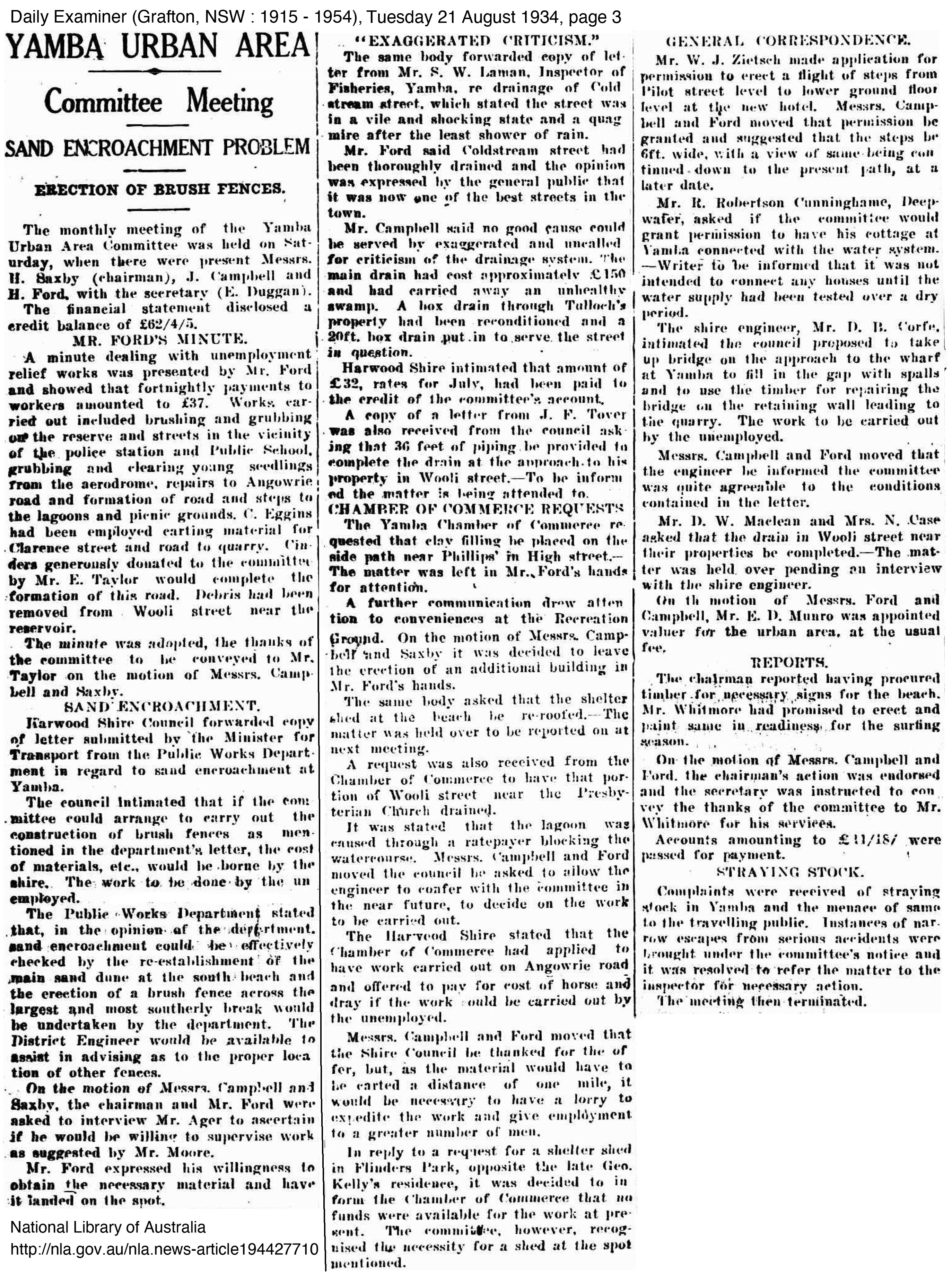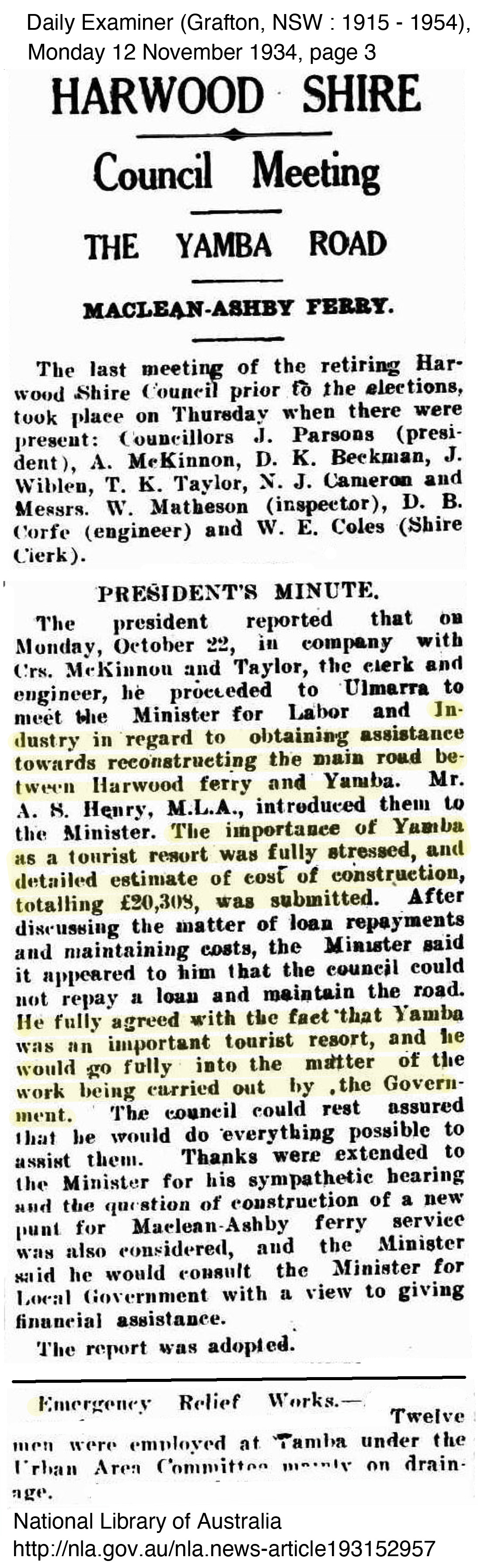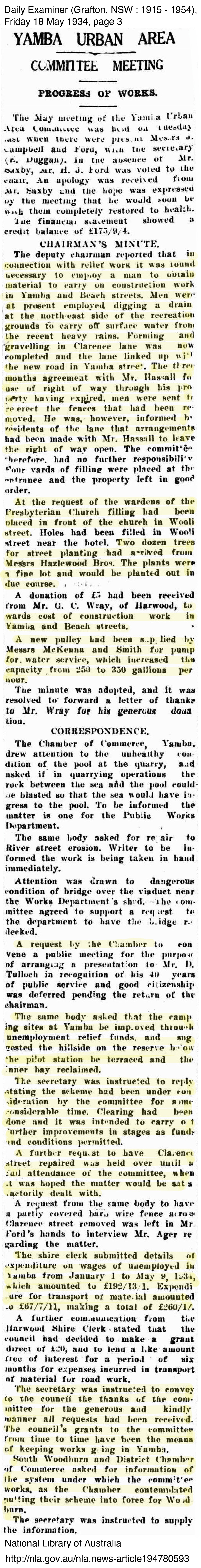 George Perkins mentioned little of the relief work he did, perhaps because of the stigma involved in being part of a relief work crew, however the improvements he worked on were significant to the improvement of the town and its surrounds. In Yamba at least, they appeared to be grateful to be able to have men to work on improving the township. The importance of Yamba as a holiday resort town to the Clarence continued to grow with Harwood recognising the relief work scheme driven by John Ford and the Committee. In fact the scheme worked so well that other shires such as South Woodburn and approached the Yamba Urban for information on how they ran the scheme so successfully to which they always supplied information to those who requested. The following newspaper articles outline some of the work completed at the time George worked with the relief crew.