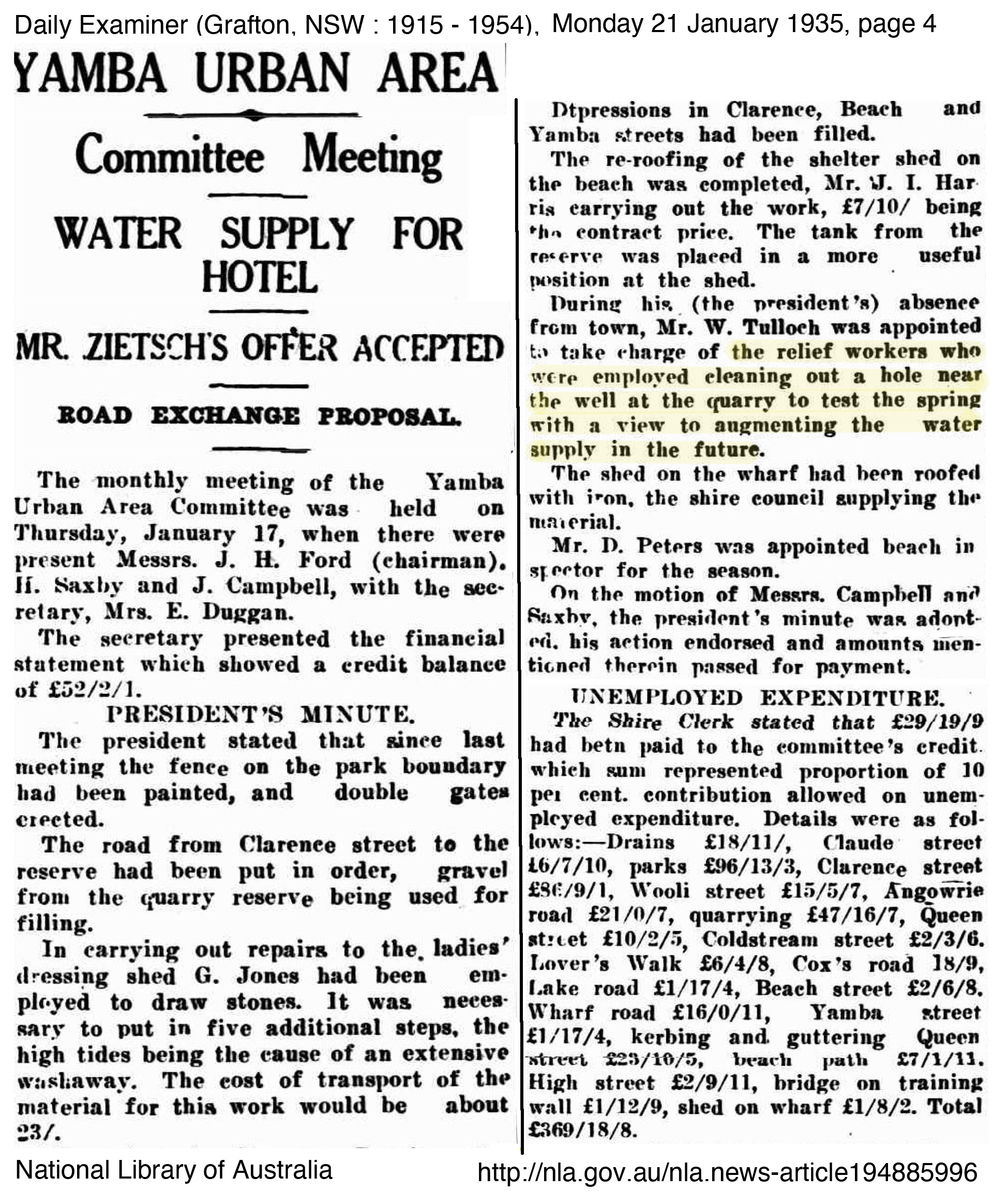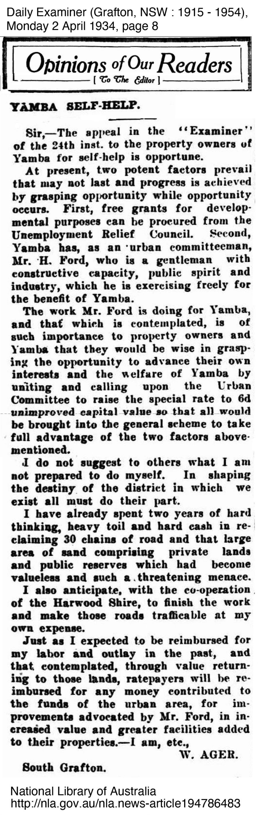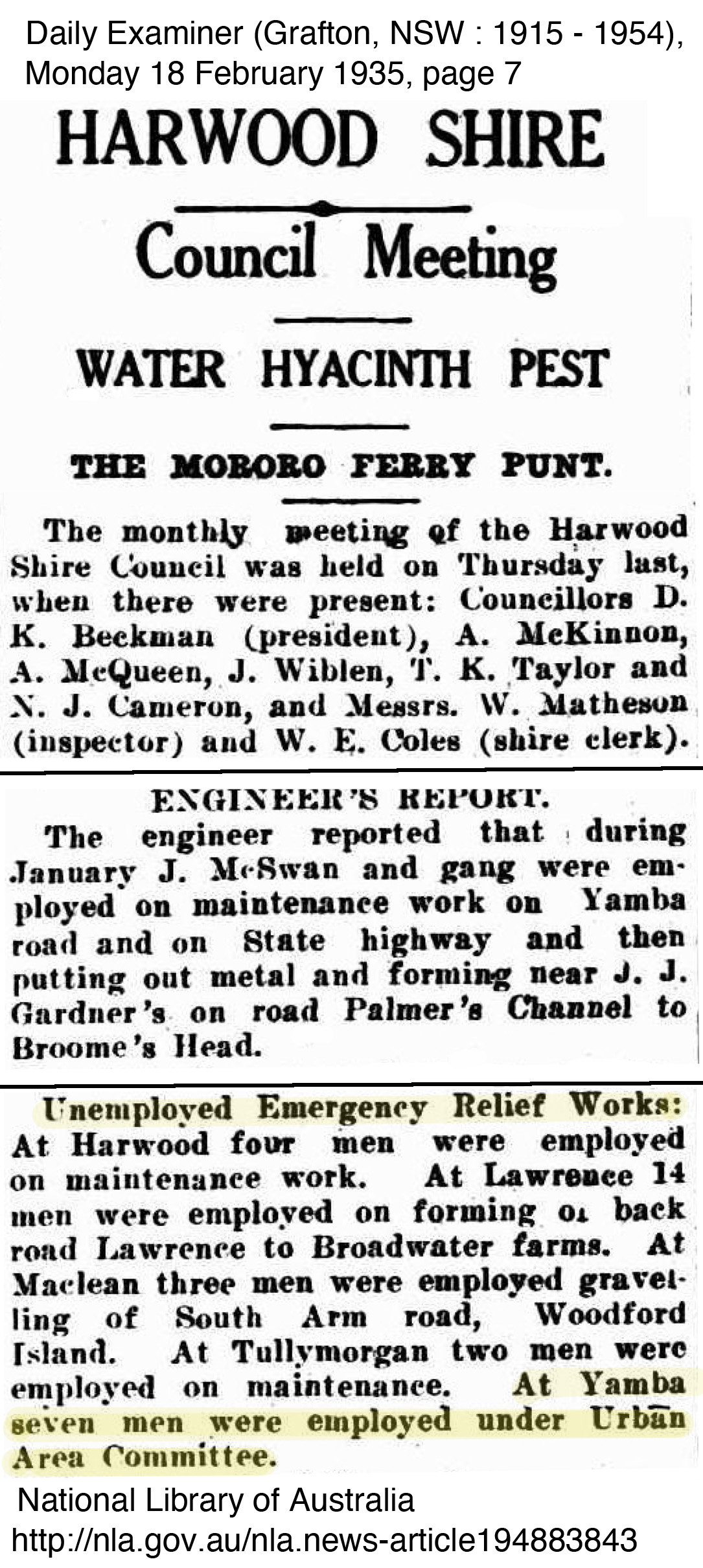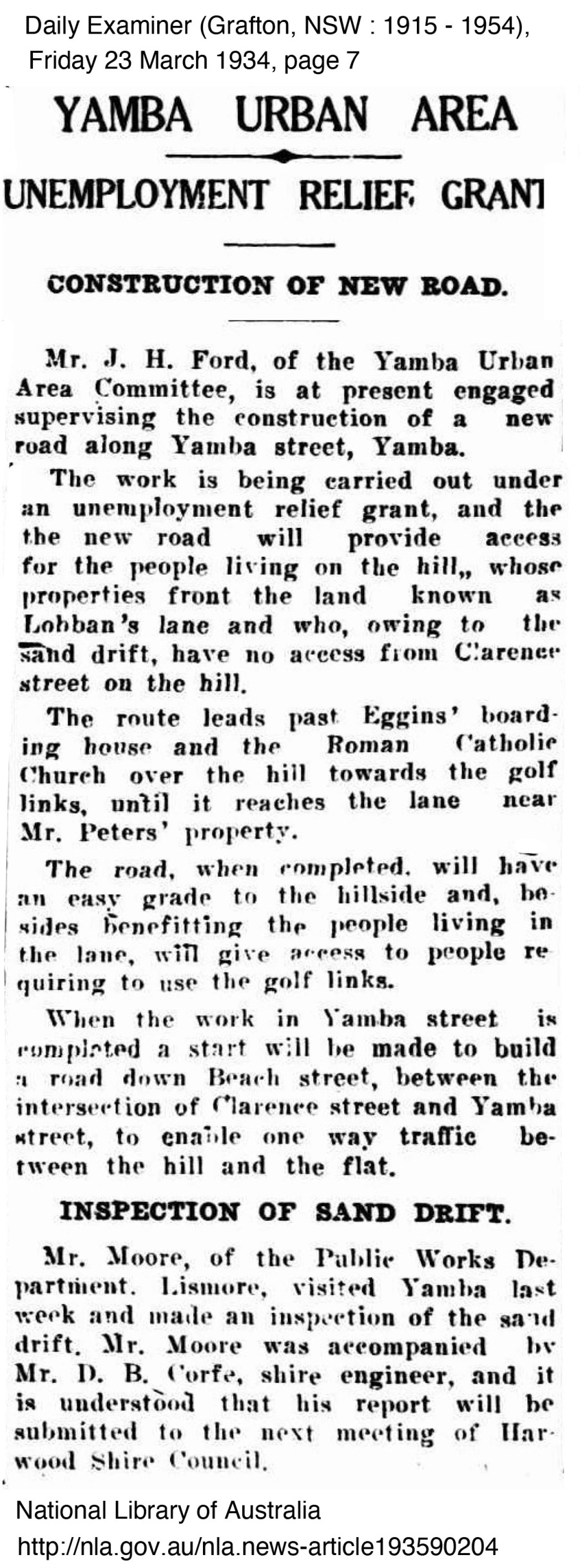 George Perkins mentioned little of the relief work he did, perhaps because of the stigma involved in being part of a relief work crew, however the improvements he worked on were significant to the improvement of the town and its surrounds. In Yamba at least, they appeared to be grateful to be able to have men to work on improving the township. The importance of Yamba as a holiday resort town to the Clarence continued to grow with Harwood recognising the relief work scheme driven by John Ford and the Committee. In fact the scheme worked so well that other shires such as South Woodburn and approached the Yamba Urban for information on how they ran the scheme so successfully to which they always supplied information to those who requested. The following newspaper articles outline some of the work completed at the time George worked with the relief crew.