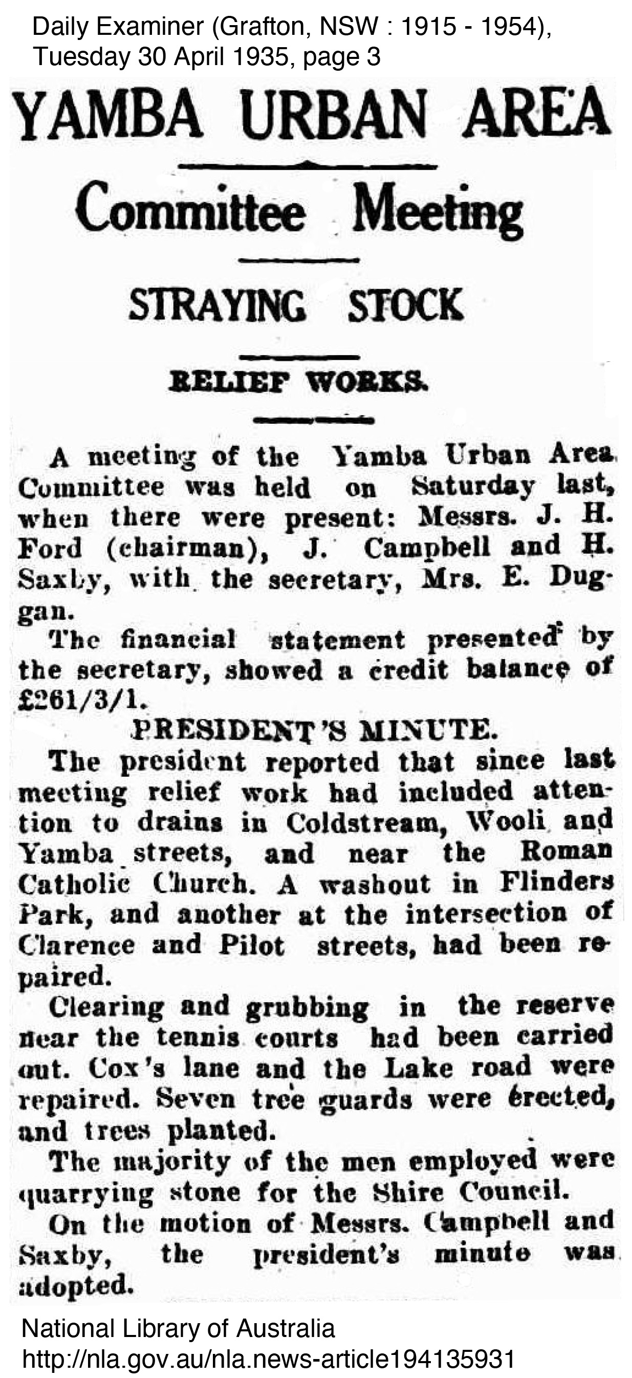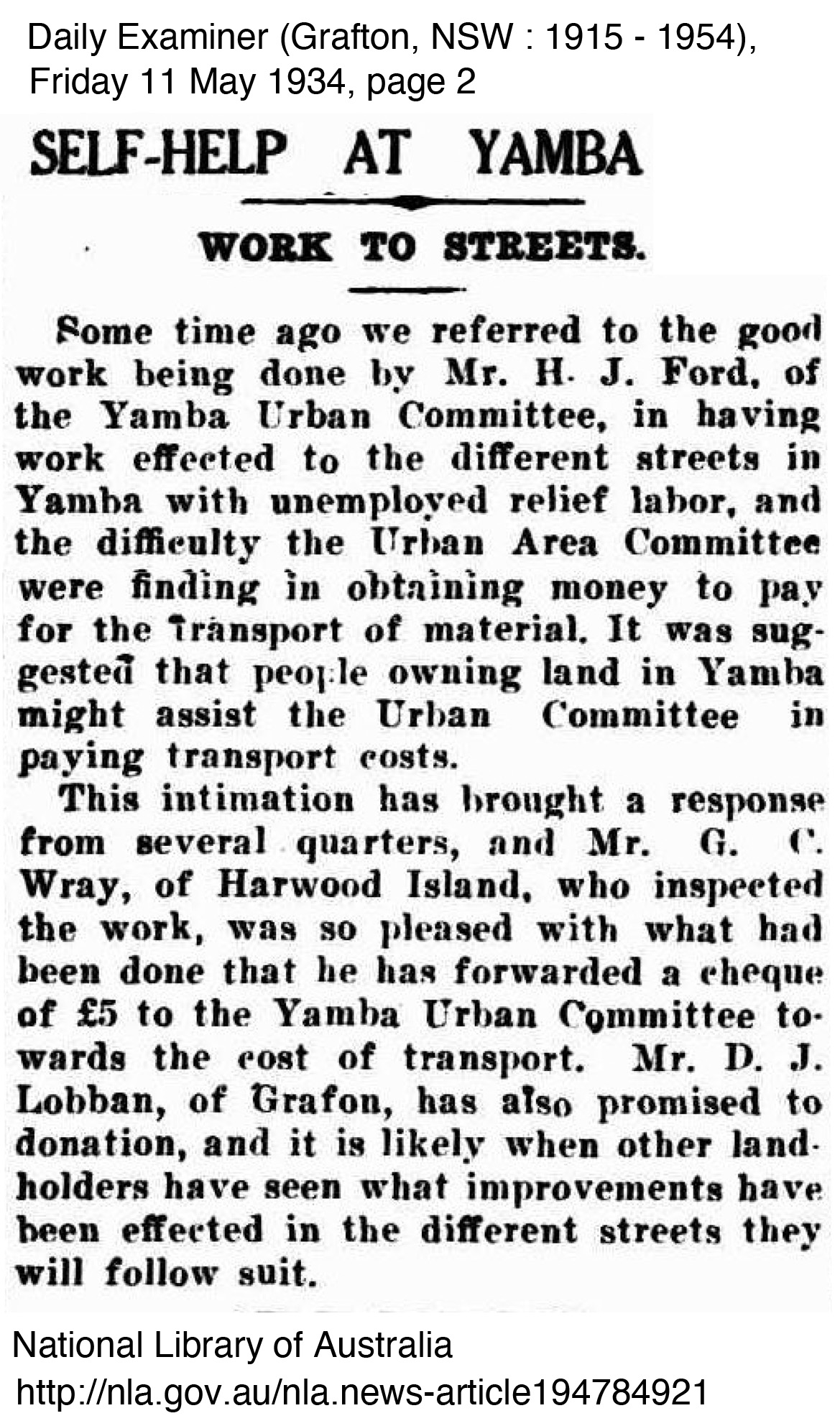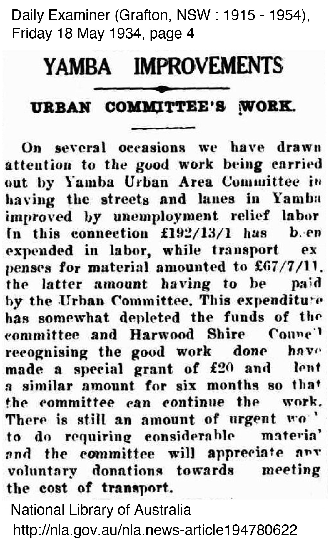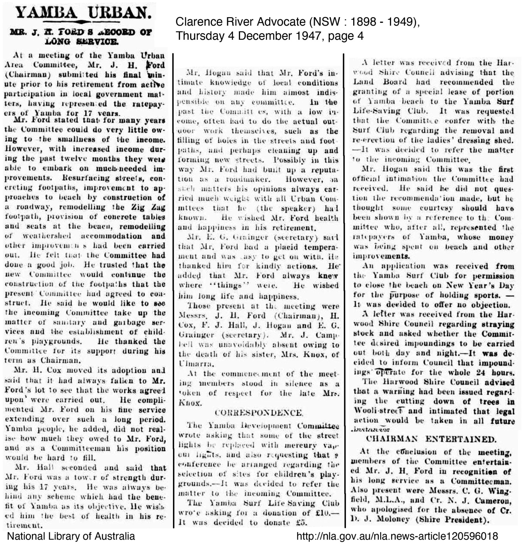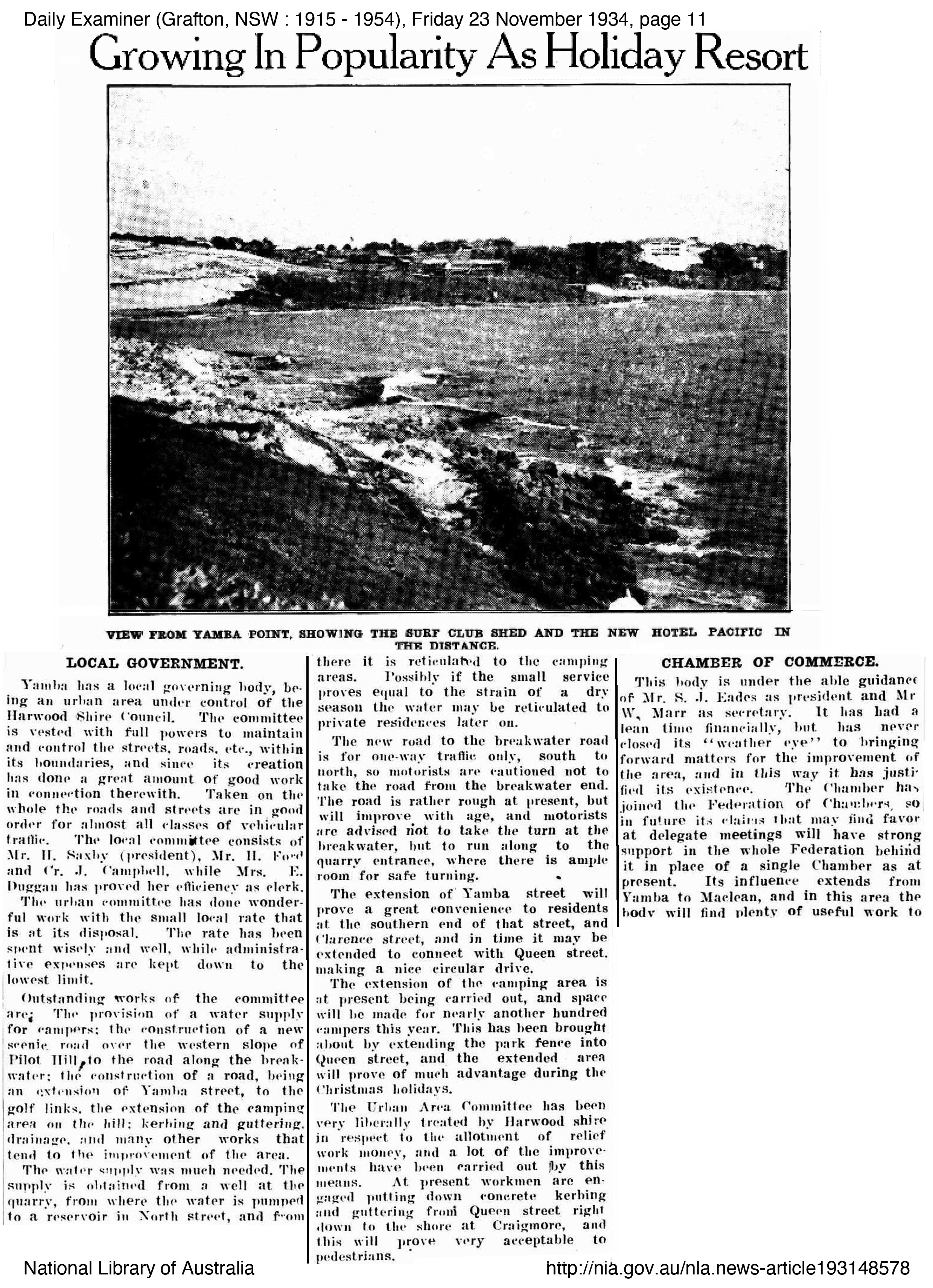 George Perkins mentioned little of the relief work he did, perhaps because of the stigma involved in being part of a relief work crew, however the improvements he worked on were significant to the improvement of the town and its surrounds. In Yamba at least, they appeared to be grateful to be able to have men to work on improving the township. The importance of Yamba as a holiday resort town to the Clarence continued to grow with Harwood recognising the relief work scheme driven by John Ford and the Committee. In fact the scheme worked so well that other shires such as South Woodburn and approached the Yamba Urban for information on how they ran the scheme so successfully to which they always supplied information to those who requested. The following newspaper articles outline some of the work completed at the time George worked with the relief crew.