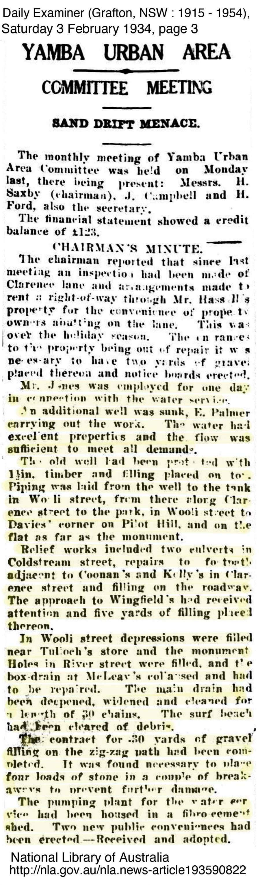 The work of the relief working group that George Perkins would have been a part of as part of the relief working group 1933-1935 is recorded and they carried out some significant work around the town on roads including the new scenic road over the western side of Pilot Hill, water supply and upgrades of camping, kerb and guttering and even planted 50 of the iconic trees, Araucaria excelsa the Norfolk Island Pine trees (now known as Araucaria heterophylla) for which Yamba is known and had been first planted along Wooli Street in 1931 likely as part of the new Yamba Urban Committee (including J H Ford) prominence. At this time the water supply, wells and drainage around Yamba was being updated and improved which meant that the men on relief work would have had a fair amount of knowledge about the water supplies and maintenance in Yamba. This knowledge alongside the knowledge passed onto him by family informed George about the whereabouts of ‘Flinders Well’ which he maintained was around from the bottom of Clarence Street towards the old Quarry. He raised his concerns that the monument position was incorrect but he was dismissed. NOTE TO BE EXPANDED IN ANOTHER CHAPTER