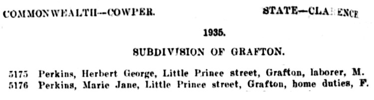 A second 1935 Electoral Roll lists George and Marie Perkins living in Prince Street, Grafton, this was a rented flat and is pictured below. George’s occupation at this time was listed simply as a ‘labourer’. On 1 July 1935 their second child, a son they named Colin George was born again at Runnymede Hospital in Grafton. They remained on the Electoral Roll living in Prince Street Grafton until the 1937 roll.