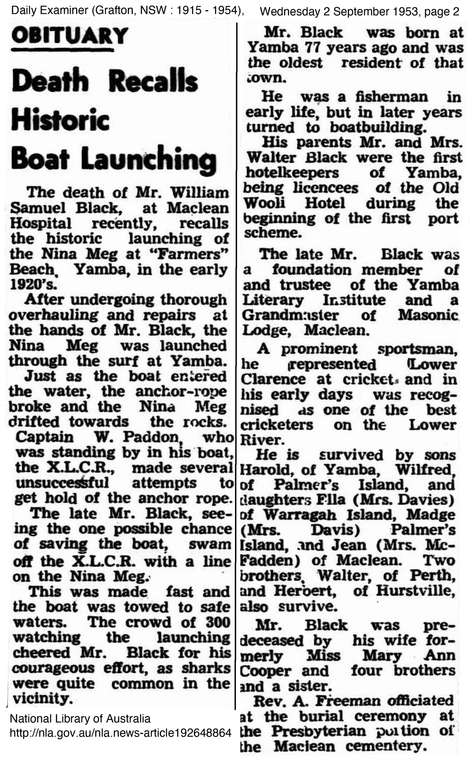The Yamba Urban Committee under the driving force of John ‘Henry’ Ford were largely responsible for organising the Emergency Relief Work which would now essentially be called ‘work for the dole’ and garnering support and financing to carry out any improvements to the township of Yamba. There is a link between Henry Ford and the family of George Perkins via his grandmother Jane Frances Schaumann nee Freeburn. Jane had inherited all the land from the original 1872 Land Grant to her father Francis Freeburn. On 11 July 1922 Jane sold number 34 Wooli Street which consisted if lots 3 and 4 of portion 10 to Jessie Scott nee Macdonald the widow of Walter Scott who had died in Ontario. Canada in 1916.2 On 3 October 1927 the property was sold by Jessie Scott to John Henry Ford ‘retired farmer’ known as Henry Ford and on 28 August 1954 the property transferred to his son Lawrence Black and daughter Lillian May Black nee Ford. Lil Black was the wife of Walter Harold Black who when they married was a bus driver and later a boatbuilder. Walter Harold Black was the son of Walter Samuel Black and grandson of Walter Black who owned the Wooli Hotel in Yamba.