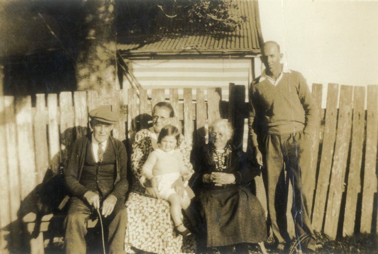 Family photographs taken about 1935 when Lorna Perkins was about 2 years of age, show Marie and George’s eldest child Lorna standing outside her step grandfather herb Russell’s Bookmakers old timber building at what is now 38 Wooli St with her great grandmother Jane Frances Schaumann nee Russell. A second photo which looks like the same day based on Lorna and her great grandmother Jane wearing the same clothes. shows her with her great Uncle Captain James Freeburn, Lorna sitting on her grandmother Anne May Russell’s knee with her great grandmother Jane Schaumann and father, George Perkins.
